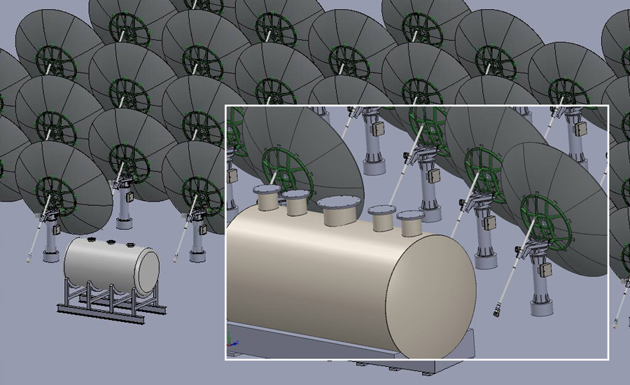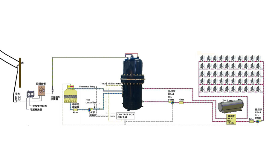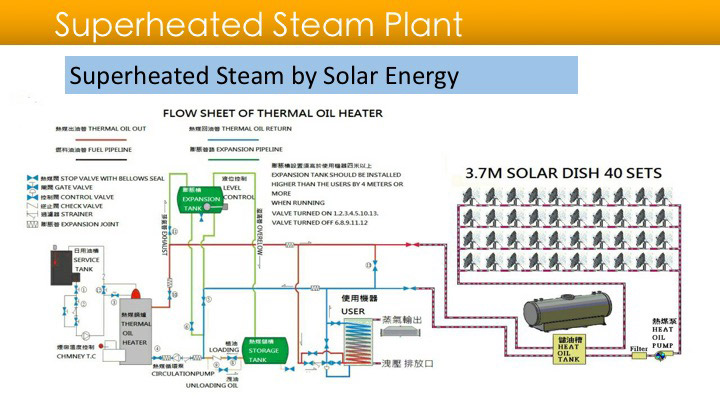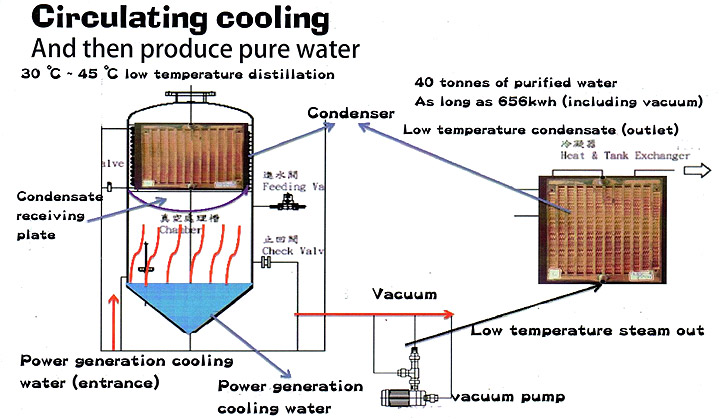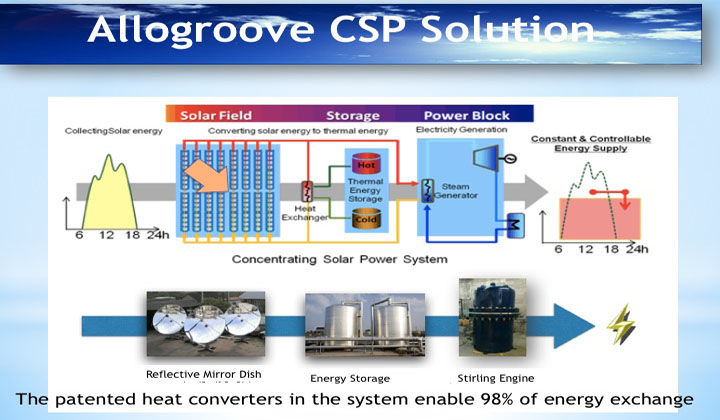 It uses Allogroove CSP solar heat to generate electric power needed, and desalinate seawater by patented low-temperature evaporation technology, then sterilize desalinated water to drinking water at 105 Co temperature with solar heat.